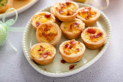 Pour des mini quiches, utilisez une pâte brisée découpée en cercles, remplissez-les d'un mélange de fromage râpé, œufs, crème et herbes fraîches, puis faites cuire au four à 180°C pendant 15 à 20 minutes jusqu'à dorure.