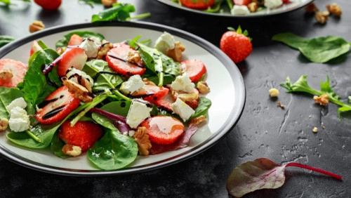 Ingrédients : pousses d’épinard, fraises en quartiers, noix concassées, feta émiettée, vinaigrette balsamique.