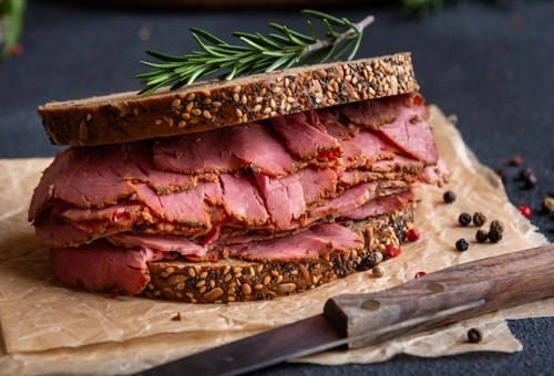 Le pastrami peut accompagner des plats légers comme une salade tiède de pommes de terre nouvelles et pastrami avec une vinaigrette à la moutarde, ou un bol de riz complet agrémenté de légumes croquants et pastrami, ce qui permet d'allier saveur et équilibre nutritionnel.