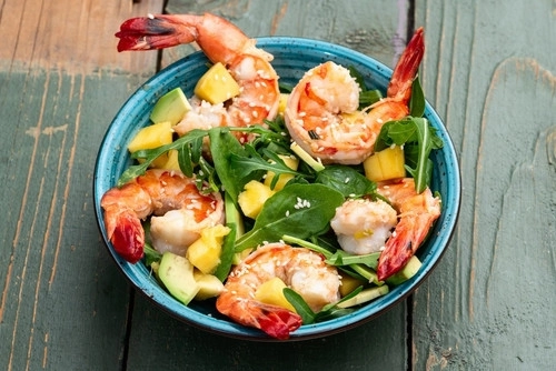 1. Salade de mangue, avocat et crevettes grillées