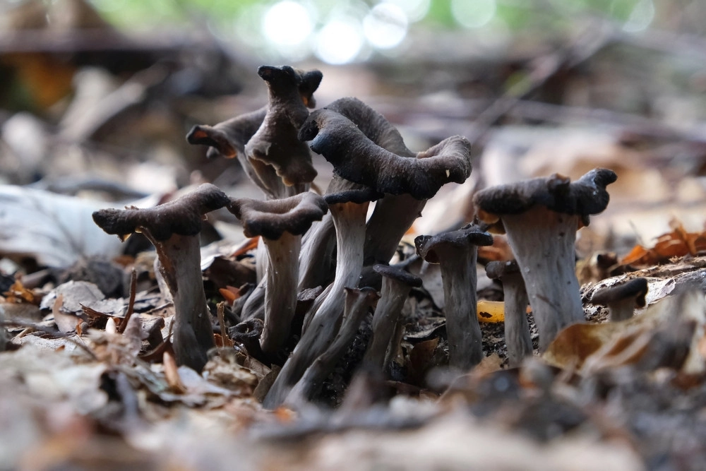 Les trompettes de la mort, ou Craterellus cornucopioides, sont des champignons sauvages noirs ou gris en forme de trompette. Elles ont une texture fine et un parfum intense, terreux, avec un goût riche rappelant les cèpes mais plus complexe. Elles poussent à l'automne sous les feuillus en forêt.