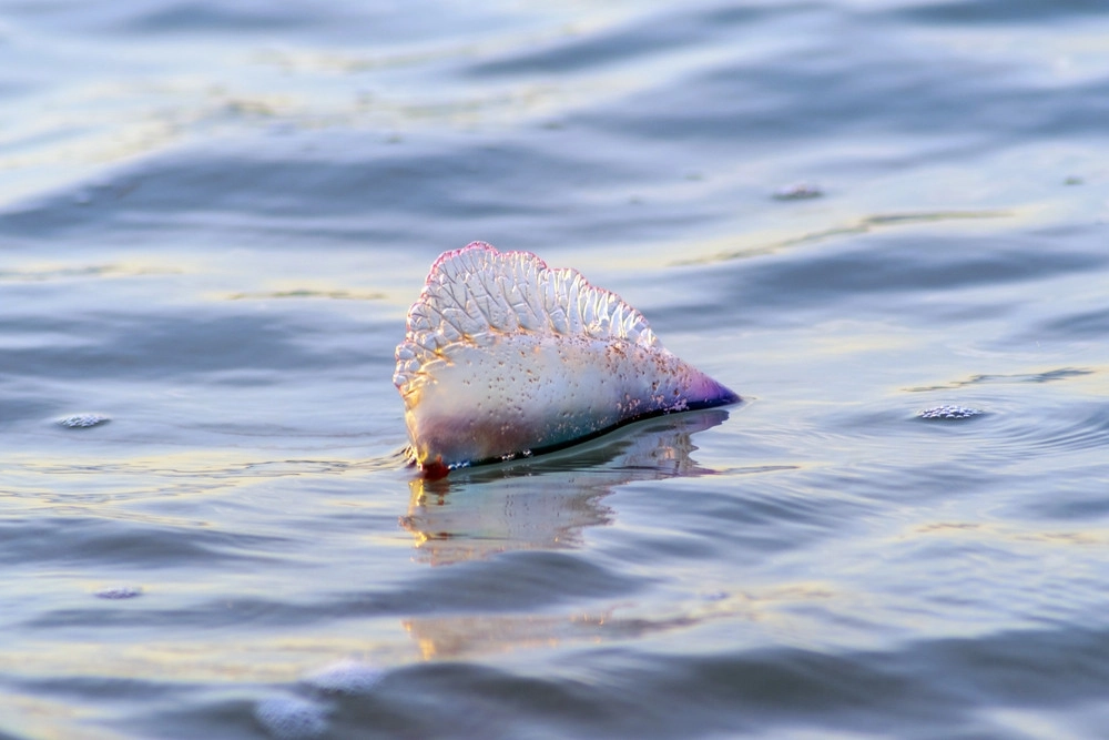 La physalie est un organisme marin constitué de plusieurs organismes associés, reconnaissable à sa vessie flottante bleutée ou violacée qui ressemble à un petit ballon posé à la surface de l'eau, sous laquelle pendent de longs tentacules urticants.