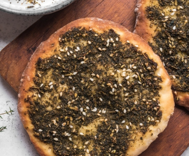 - Mélanger le zaatar (mélange de thym, sésame, sumac) avec l’huile d’olive et étaler cette pâte sur la galette.