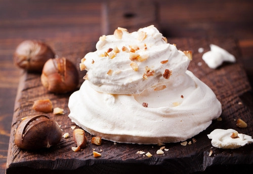 La pavlova est un dessert classique à base de meringue croquante à l’extérieur et moelleuse à l’intérieur. En y ajoutant la crème de marrons et des morceaux de marrons glacés, on obtient :