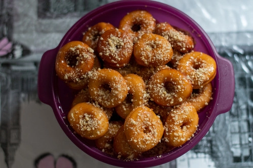 La pâte est préparée en battant les œufs avec le sucre, puis en ajoutant l'huile, le yaourt, les zestes et la levure, avant d'incorporer la farine afin d'obtenir une pâte souple. Après un repos de 30 minutes, la pâte est divisée en petites boules que l'on roule en boudins, puis on soude leurs extrémités pour former des anneaux.
