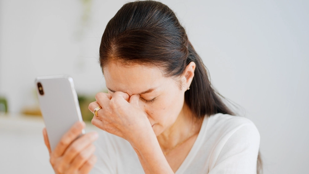 Passer de longues minutes, voire des heures, les yeux rivés sur un smartphone favorise une posture inclinée vers l’avant. Cela crée des tensions dans le cou, les épaules et les muscles autour des yeux, accentuant la fatigue.