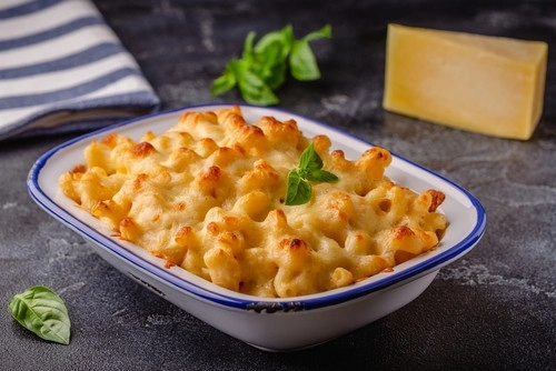 Le cheddar est un fromage à pâte dure originaire d’Angleterre, apprécié pour sa texture fondante et sa saveur légèrement fruitée et corsée. Lorsqu’il fond, il forme une couche onctueuse et riche qui nappe parfaitement les pâtes. Il est donc idéal pour les gratins, notamment avec des pâtes qui absorbent bien la sauce comme les coquillettes, penne ou macaroni.
